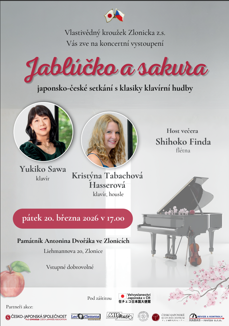 Jablůčko a sakura je česko-japonský projekt, na koncertě tedy zazní česká klasická hudba, převážně výběr ze skladeb Antonína Dvořáka z cyklů Poetické nálady, Legendy a Slovanské tance (v jednom z interview Yukiko Sawa poznamenala k A. Dvořákovi, že je v Japonsku "neobyčejně populární"), a také ukázky z díla japonské hudby. Koncertní projekt původně vznikl na podnět rakouského harfenisty slovenského původu Josefa Molnara (zemř. 2017), zakladatele moderní hry na harfu v Japonsku (nástroje, který je blízký tradiční japonské citeře). Také od Josefa Molnára zazní ukázky skladeb. Yukiko Sawa studovala hudbu na tokijské akademii a několik let v tehdejším Československu, kde na ní silně zapůsobila osobnost českého klavíristy a pedagoga prof. Josefa Páleníčka (zemř. 1991). Yukiko Sawa se velmi dobře dorozumí česky.